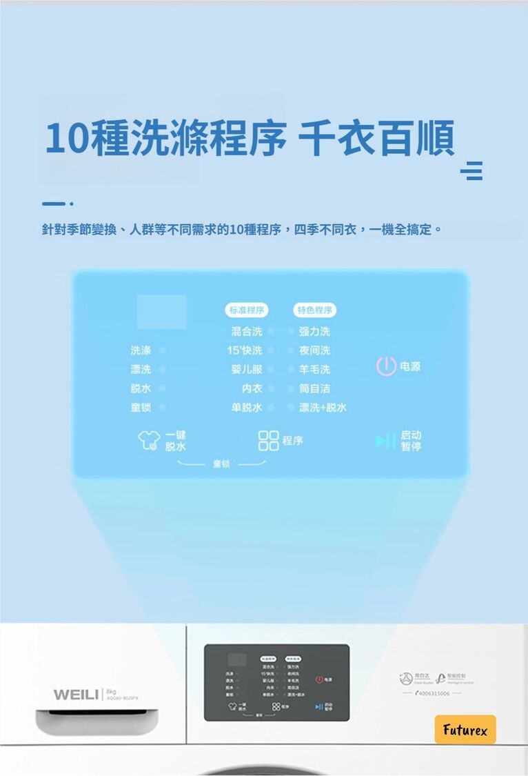 • 10種專業洗衣程序,包括嬰兒服、羊毛、夜間洗等