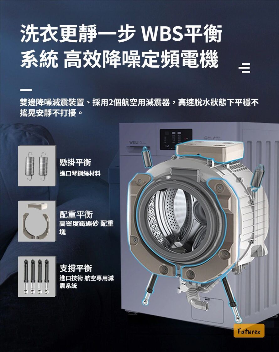 • WBS平衡系統配合航空級減震器,洗衣靜音唔嘈吵