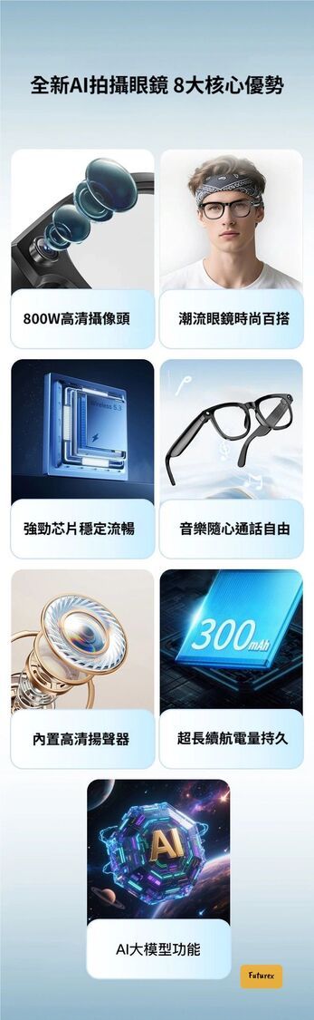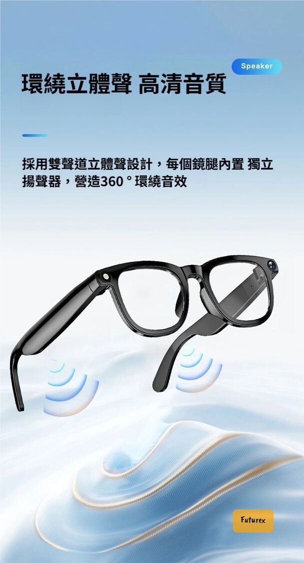 - 雙立體聲揚聲器,每邊鏡腿都有獨立喇叭,音效實淨。