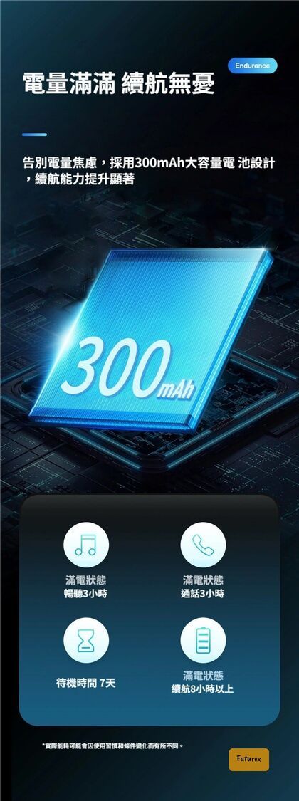 - 電池:300mAh,續航8小時以上,充電約90分鐘。