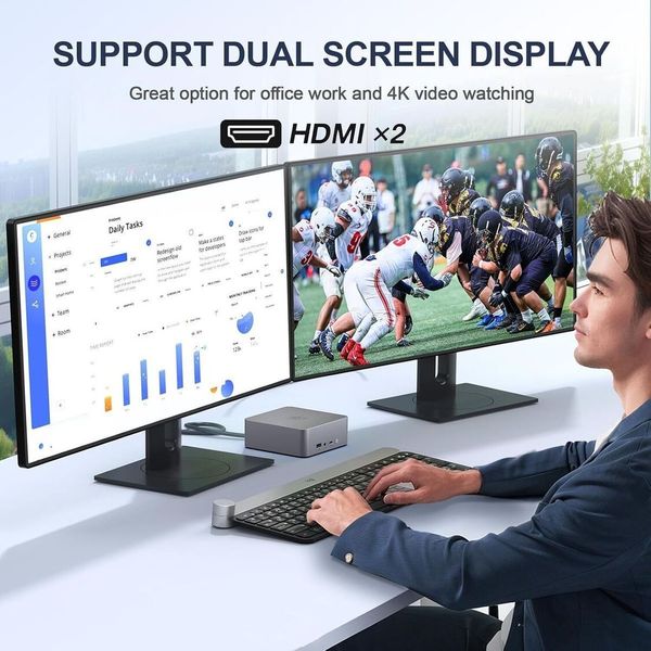 連接埠:2x USB-A 3.2, 1x USB-C 3.2, 1x USB 2.0, 2x HDMI 2.0, 1x 音訊插孔, DC