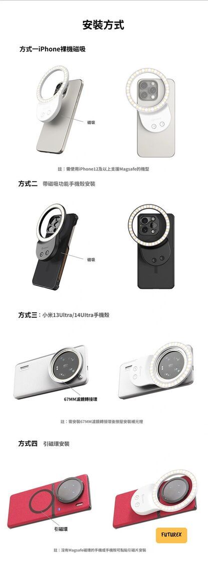 兼容性:iPhone 12以上(Magsafe)、安卓手機(需磁吸殼)、小米13U/14U(需轉接環)
