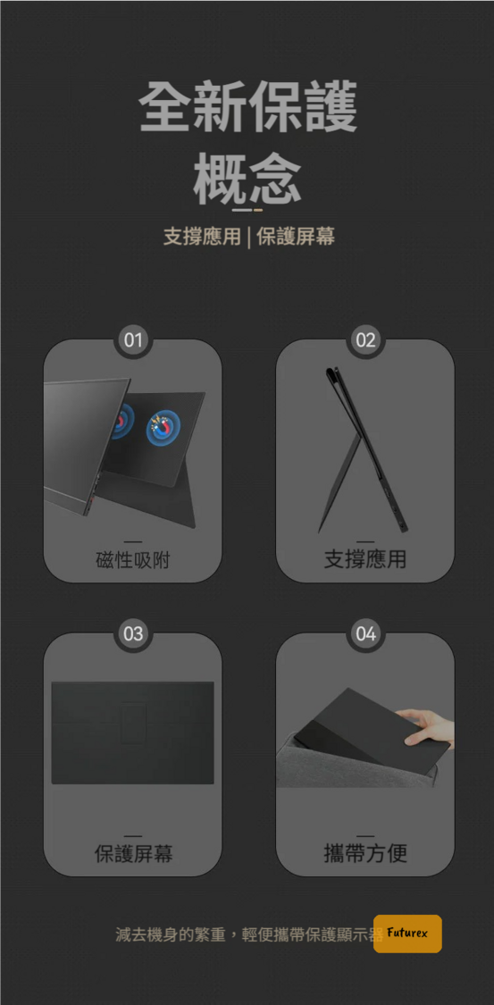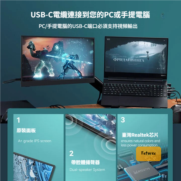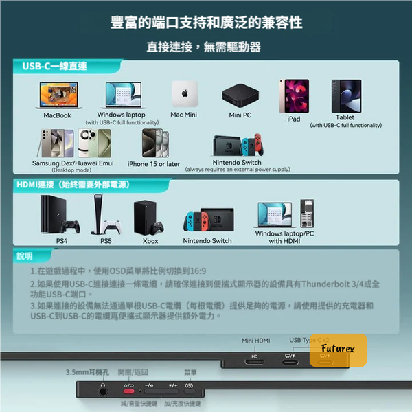 - 做筆記本或平板副屏,擴展工作或娛樂空間,USB-C或HDMI即插即用。