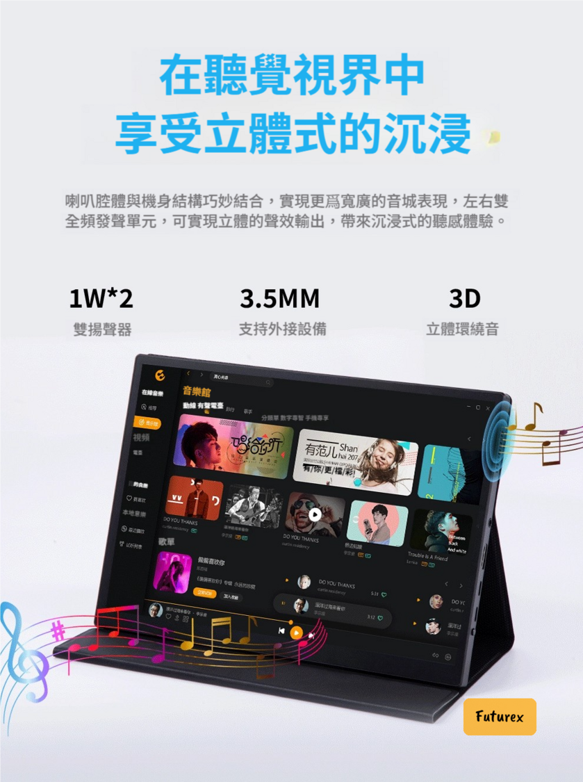 - 內置雙1W揚聲器同3.5mm音頻插孔,立體聲環繞,聽歌睇戲沉浸感強,仲可以外接耳機。