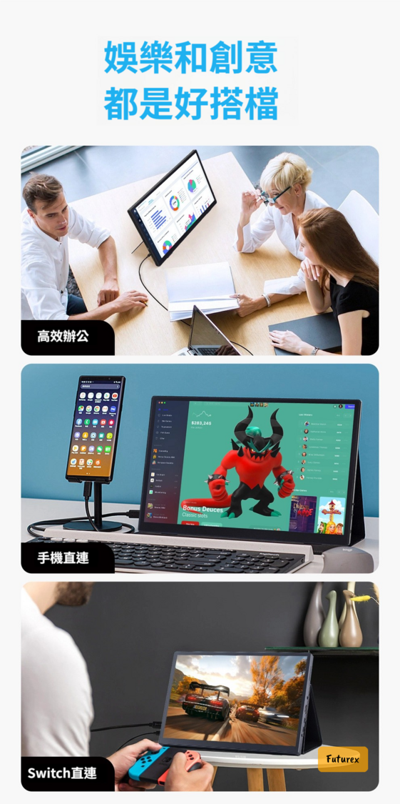 - 辦公:連接手機或筆記本做延伸屏幕,多工處理、觸控演示,提高工作效率。
