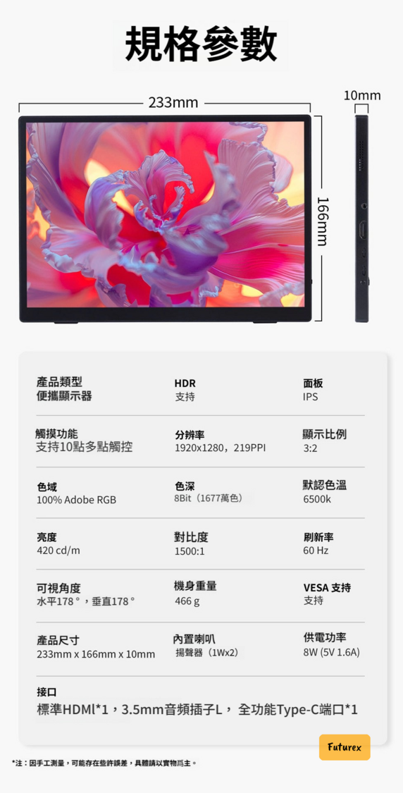 - 產品類型:便攜觸摸顯示器