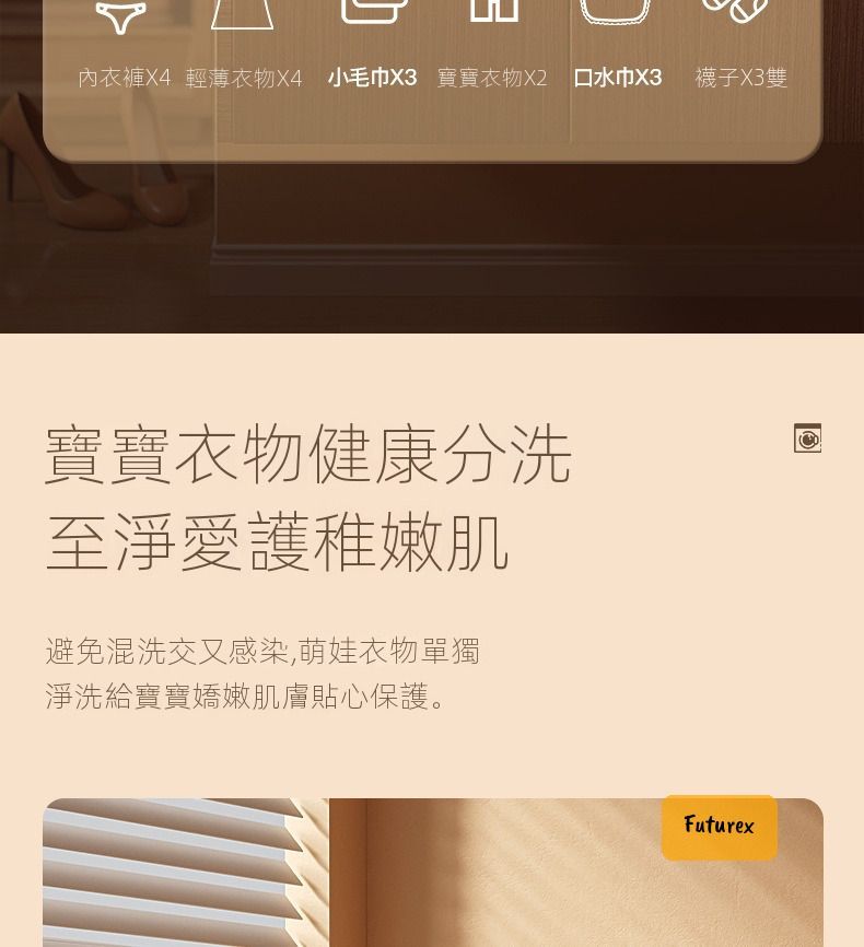 - 4合1健康分洗:內衣褲(4件)、BB衫(2件)、襪(3雙)同薄衣物(4件)獨立洗