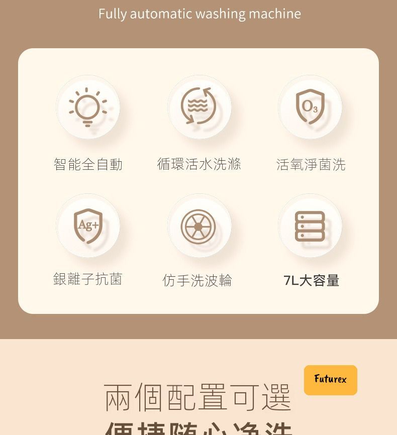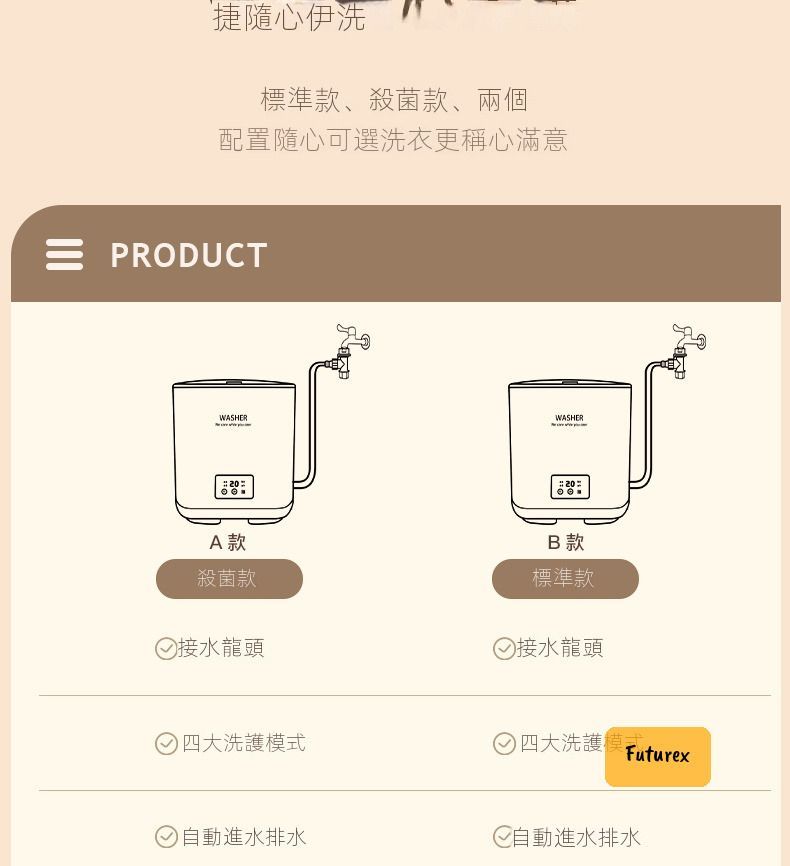 - 全自動操作:接水龍頭自動入水+排水+脫水(7L容量)