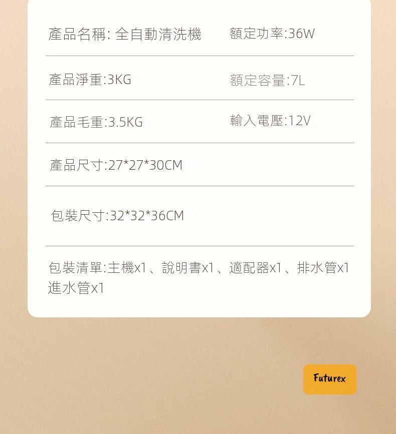 - 配件:主機、說明書、排水管、進水管