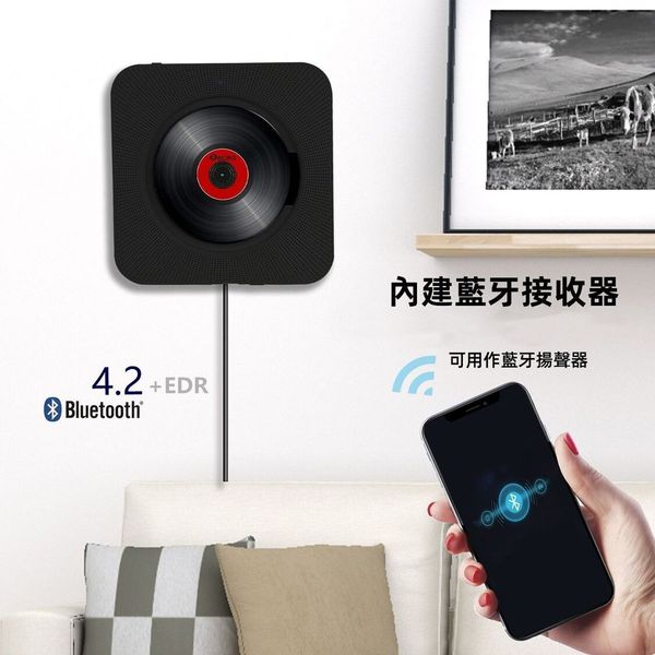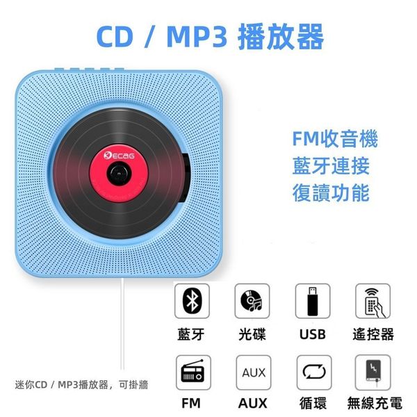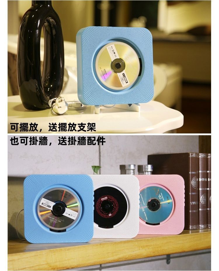 CD機,可以擺放或壁掛,送擺放支架以及掛壁配件。 4色可選,送遙控器,不支援連接電視,外觀大氣漂亮,是您的首選。 高保真喇叭,可支援3.5mm連線或藍牙連線。可播放光碟,播放U盤;FM收音機功能,AUX功能。有復讀機功能,是您學習其他語音的幫手。