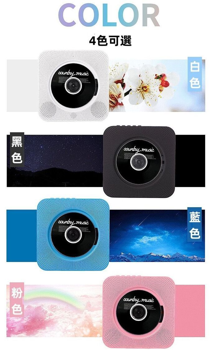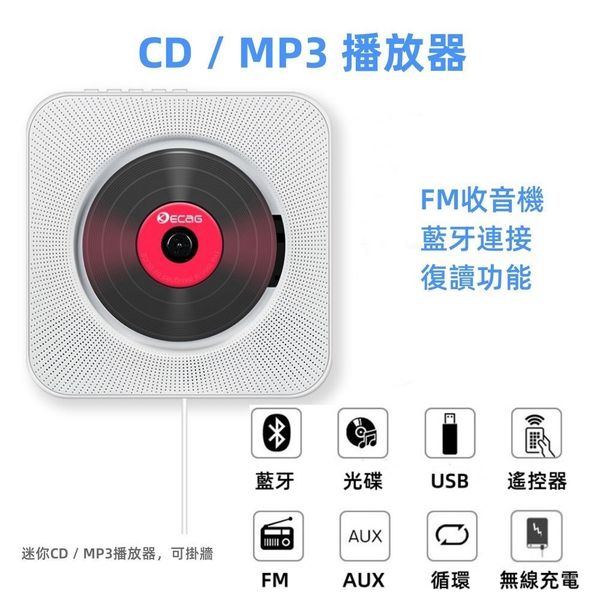 CD機,可以擺放或壁掛,送擺放支架以及掛壁配件。 4色可選,送遙控器,不支援連接電視,外觀大氣漂亮,是您的首選。 高保真喇叭,可支援3.5mm連線或藍牙連線。可播放光碟,播放U盤;FM收音機功能,AUX功能。有復讀機功能,是您學習其他語音的幫手。
