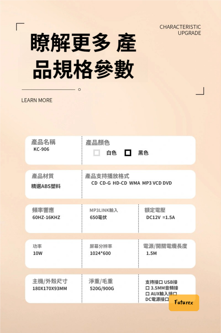 - 支持格式:CD/CD-G/HD-CD/WMA/MP3/VCD/DVD