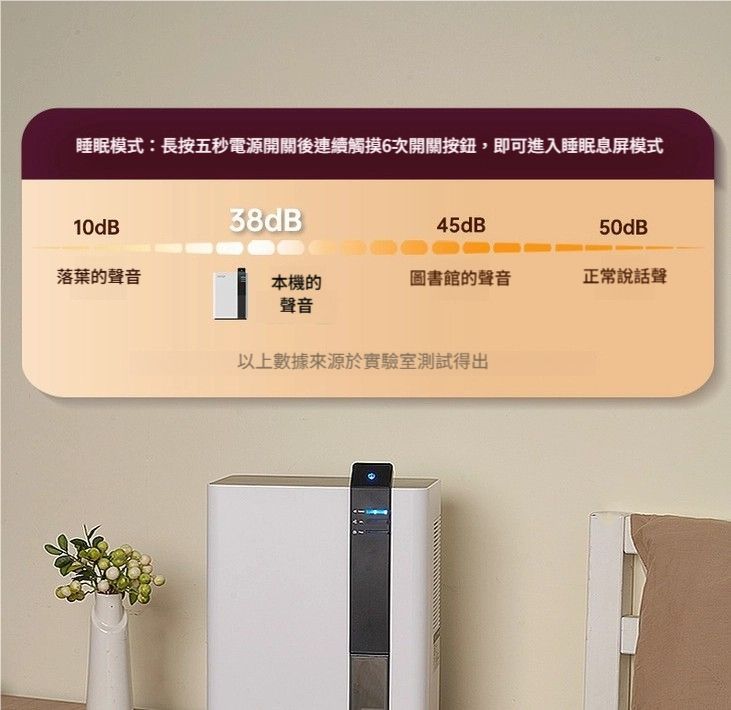 睡眠模式:長按5s電源按鈕開關後連續觸碰6次開關按鈕進入睡眠息屏模式,靜音運行,只有38dB