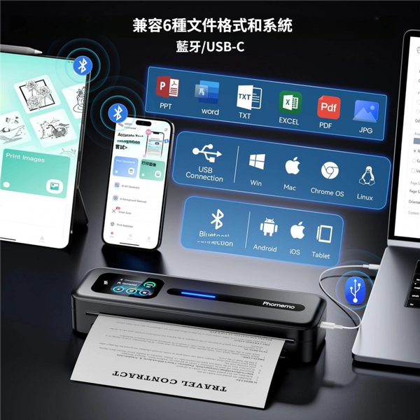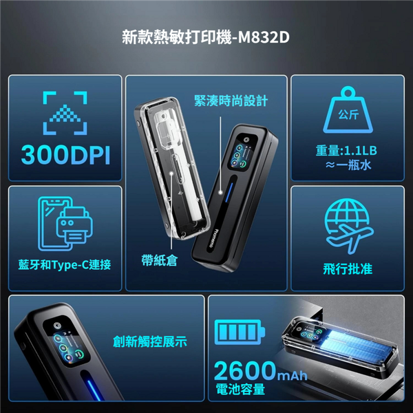 Phomemo-Phomemo M832D 便攜無墨打印機|智能觸屏|300DPI高清|藍牙/USB-C雙連接|A4/收據紙兼容