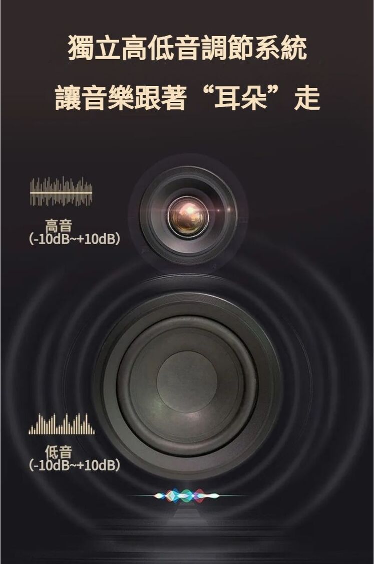 獨立高低音調節系統:內置獨立高低音調節系統,您可以根據個人喜好和環境條件,調節音響的高音與低音,讓音質更加完美。