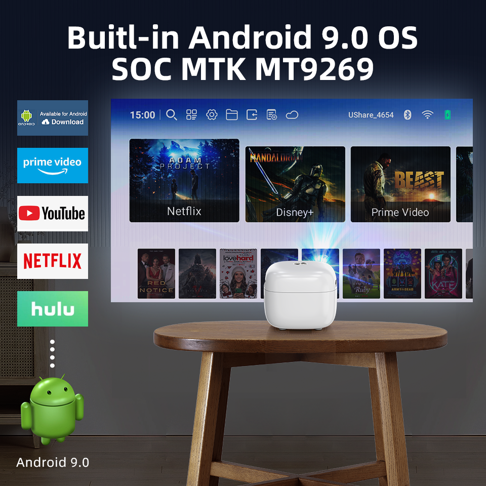 :Q6 Plus 投影儀採用超迷你尺寸設計,配備LED燈,搭載Android 9.0系統,支持藍牙和Wi-Fi無線功能,可以將任何表面轉變成60-80英寸的大屏幕。